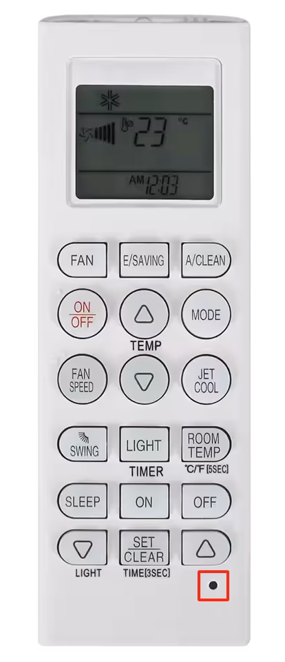 For the older LG Plasma AC remote, the reset pinhole button is placed in the bottom right corner, the button is also labelled “Reset”.